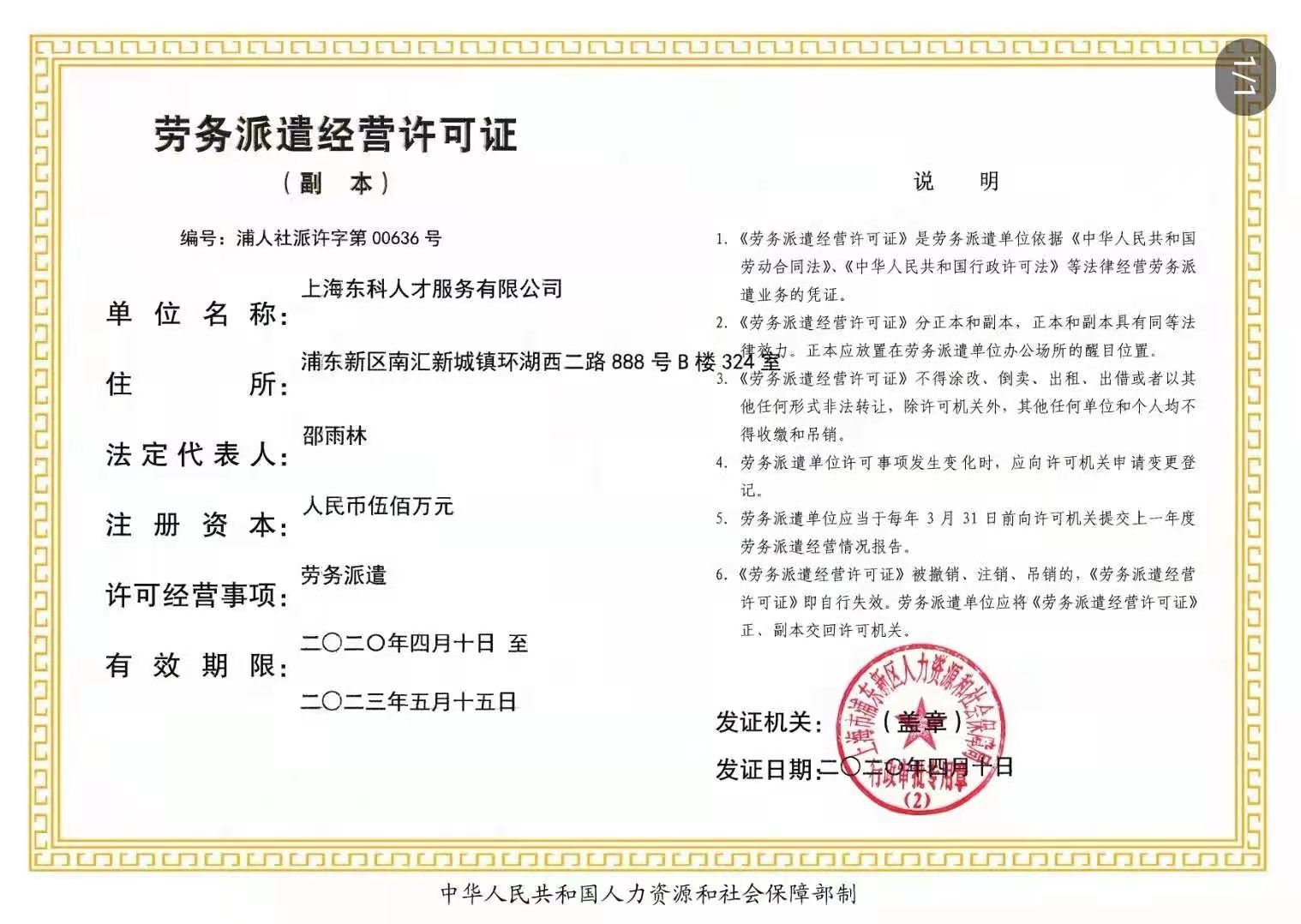 同時,該負責人出示了有效期已更新的編號為浦人社派許字第00636號的上海東科人才服務有限公司勞務派遣經營許可證副本的證明材料,其有效期為2020年4月10日至2023年5月15日(附圖)。 記者 爾東