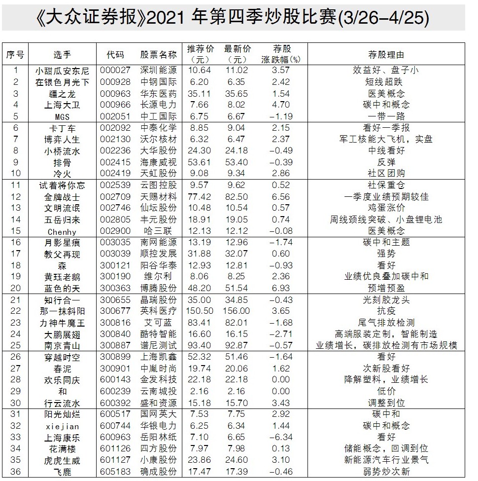 三月股市整體低迷,這從《大眾證券報(bào)》讀者俱樂部第三季炒股大賽的比賽成績(jī)可見一斑,35名參賽選手中只有11位收益為正數(shù),損失最多的選手已跌去27.9%。不過,本報(bào)炒股大賽從來都是不乏高手,第三季炒股大賽中,選手“在銀色月光下”以10.25元/股推薦的仁東控股,薦股漲幅51.22%榮獲冠軍。選手“陽(yáng)光燦爛”以1.40元/股推薦的包鋼股份,薦股漲幅49.29%榮獲亞軍。選手 “五岳歸來”以10.85元/股推薦的泉陽(yáng)泉,薦股漲幅14.19%位列第三。