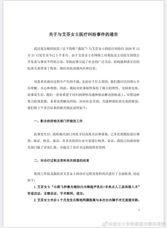 自今年年初始,武漢愛爾眼科醫院與患者艾芬的醫療糾紛事件持續引發關注。4月20日,武漢愛爾眼科醫院再次發布通告,就患者艾芬對白內障診療過程提出的質疑做出回應:患者艾芬有手術適應證、無禁忌證,手術順利、成功;術后5個月發生的視網膜脫離與白內障手術無直接關聯。