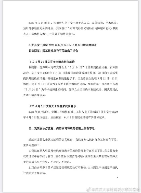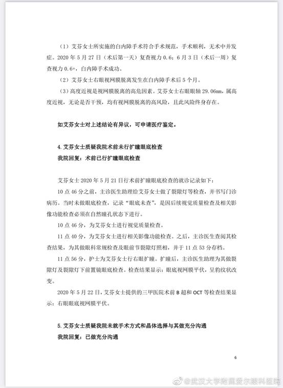 該通告核心圍繞四點:一是患者艾芬“右眼飛秒激光輔助白內障超聲乳化+多焦點人工晶體植入術”有適應證,無禁忌證,手術順利、成功;二是患者艾芬術后5個月發生的右眼視網膜脫離與本次白內障手術無直接關聯;三是患者艾芬所有病歷資料真實,無篡改、無偽造;四是武漢愛爾眼科醫院在診療流程、病歷書寫和規范管理上存在不足。醫院反復表示,其核查結果可供醫療鑒定和司法裁判。如患者艾芬對院方結論有異議,可申請醫療鑒定。