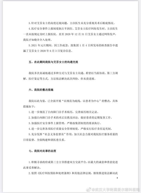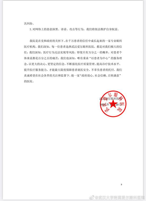 武漢愛爾眼科醫院表示,將繼續尋求政府或第三方主導搭建雙方交流平臺,也將依照《醫療糾紛預防和處理條例》和其他法律法規,繼續推進依法解決此次糾紛。通告最后,醫院對診療過程中存在的不足提出了具體的整改措施,同時表示,對網絡上的惡意抹黑、誹謗、攻擊等行為,將依法維護自身權益。