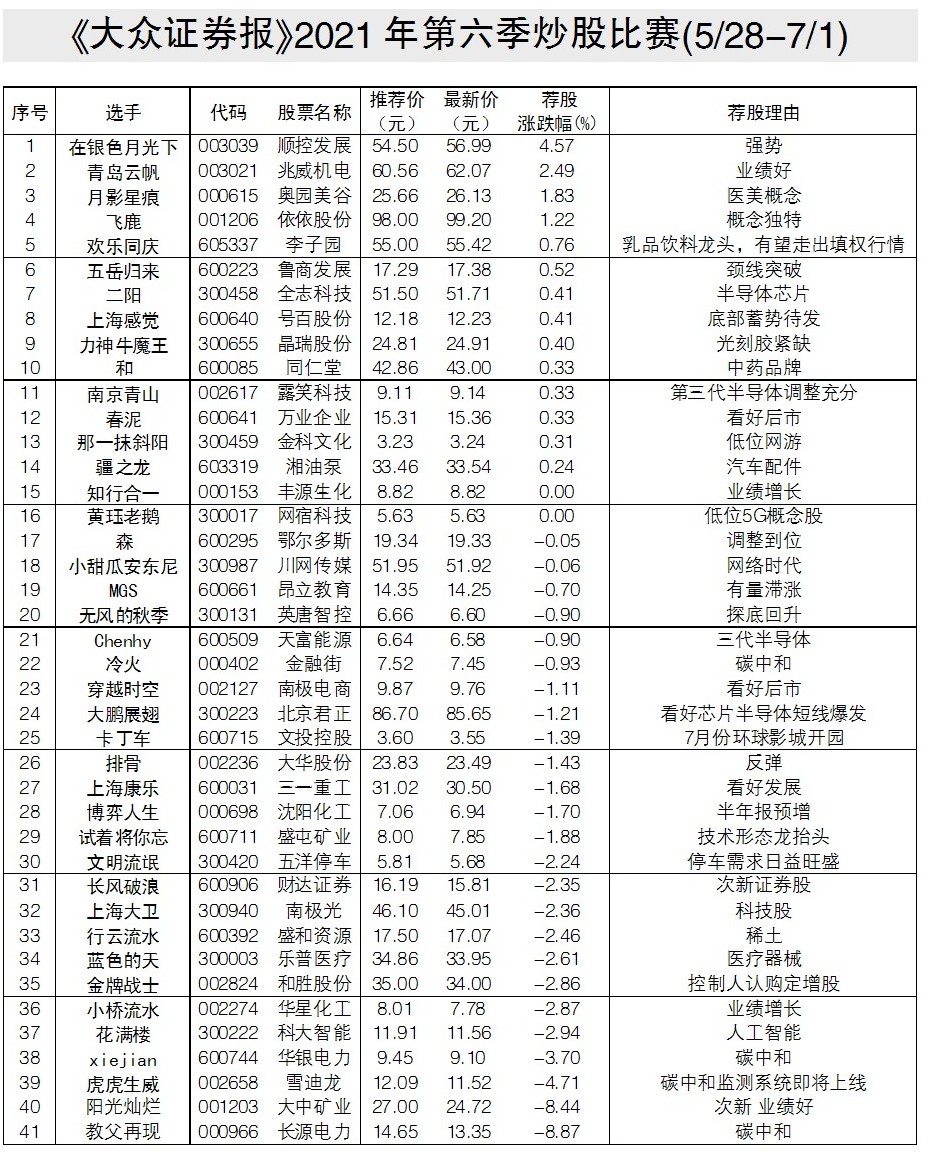 近期A股市場重新活躍,北上資金的大舉進場掃貨給投資者帶來了信心,《大眾證券報》第六季炒股大賽也如期進行,比賽時間截至2021年7月1日。報名當日,網友 “在銀色月光下”以54.50元/股推薦的順控發展,以薦股漲幅4.57%暫列第一。