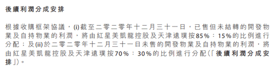 根據遠洋公告,截止2020年12月31日,紅星地產已售但未結轉的開發物業及自持物業的利潤,將由紅星控股與天津遠璞按照85%:15%的比例進行分配;截止2020年12月31日,未售的開發物業及自持物業的利潤,將由紅星控股和天津遠璞按70%:30%的比例進行分配。