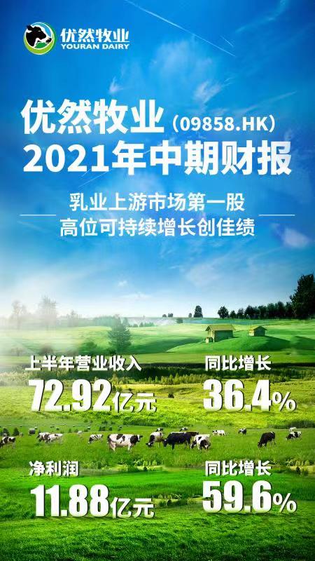 8月27日,優然牧業(09858.HK)發布2021財年中期業績公告。報告期內,公司營業收入72.92億元,同比增長36.4%;凈利潤11.88億元,同比增長59.6%;利潤率同比從13.9%增長至16.3%,年化凈資產收益率同比從15.8%增長至16.9%。