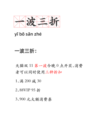 在今晚的第一波售賣期,消費者可以買買買、付尾款,同時使用3種折扣:滿200減30、88VIP領(lǐng)900元大額消費券、再疊加95折。網(wǎng)友調(diào)侃:“真是一波三折!”