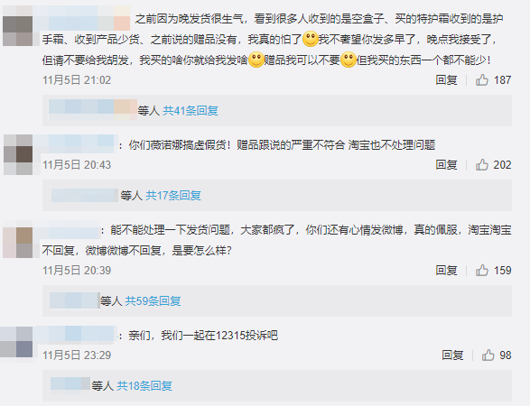 薇諾娜官方微博下有不少關于虛假發貨的投訴