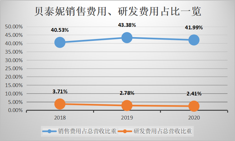 貝泰妮銷售費用、研發費用占總營收比重數據