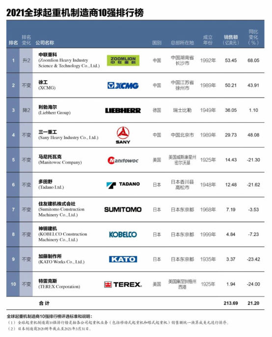 中國企業(yè)首次“奪冠”! 中聯(lián)重科問鼎“2021全球起重機(jī)制造商10強”榜首