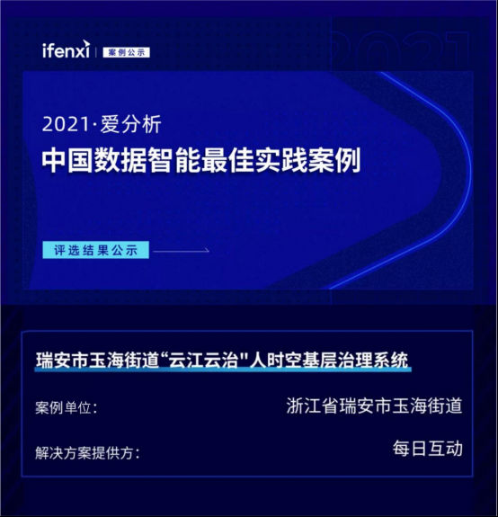 近日,“2021愛分析·中國數據智能最佳實踐案例”評選征集活動落下帷幕。該評選活動由中國領先的產業數字化研究與咨詢機構愛分析舉辦,面向金融、制造、能源、智慧城市等行業,圍繞領先性、創新性、成熟度、價值創造四個維度評選出17個最佳實踐案例。數據智能A股上市企業每日互動(股票代碼:300766)公共服務面向基層治理打造的“瑞安市玉海街道‘云江云治’人時空基層治理系統”案例,從百余個參選案例中脫穎而出,入選中國數據智能最佳實踐案例。