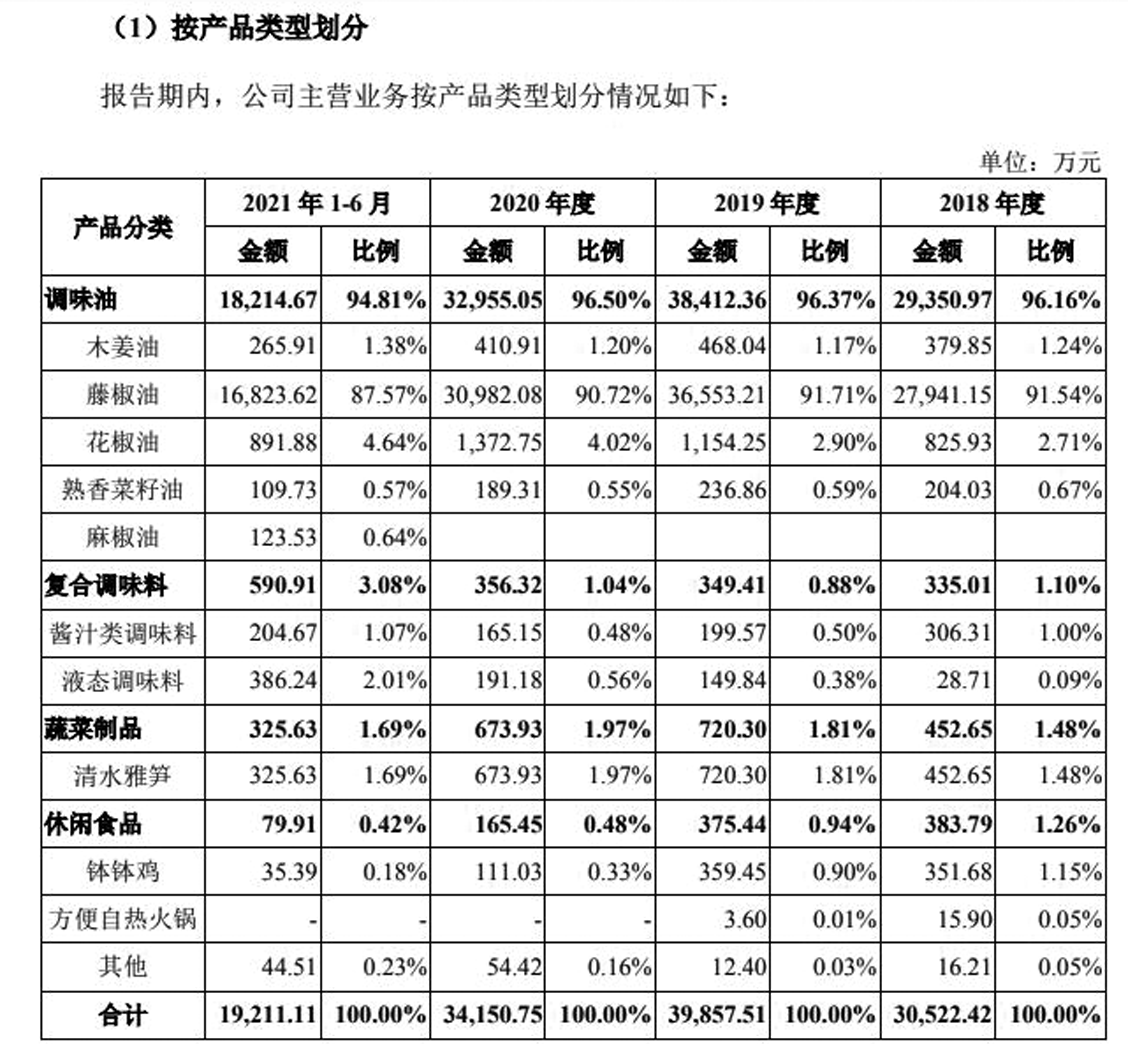 成立于2008年的幺麻子,主營業(yè)務(wù)為以藤椒油為核心的調(diào)味油、復(fù)合調(diào)味料和地方特色食品的研發(fā)、生產(chǎn)和銷售,其中藤椒油為其主打產(chǎn)品,招股書顯示,報告期內(nèi)的營收占比一直在90%上下徘徊。
