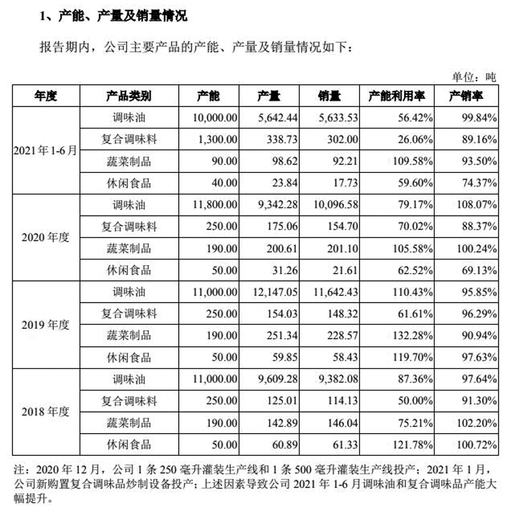 甚至在2020年營收明顯下滑時,幺麻子也沒有停下“產(chǎn)能擴張”的腳步。2020年12月,公司1條250毫升灌裝生產(chǎn)線和1條500毫升灌裝生產(chǎn)線投產(chǎn);2021年1月,公司新購置復(fù)合調(diào)味品炒制設(shè)備投產(chǎn);上述因素導(dǎo)致公司2021年1-6月調(diào)味油和復(fù)合調(diào)味品產(chǎn)能大幅提升。