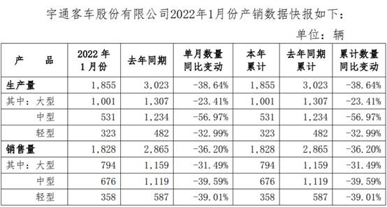 2月8日,宇通客車(600066.SH)發(fā)布2022年1月份產(chǎn)銷數(shù)據(jù)快報(bào)顯示,1月份,宇通客車銷量為1828輛,其中,大型、中型、輕型客車銷量分別為794輛、676輛、358輛。