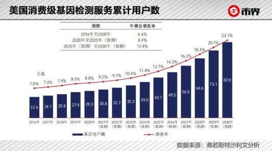 而2020年中國消費級基因檢測服務的累計消費者為1210萬人次,滲透率僅為0.8%。預計2025年,消費用戶將達到4370萬人次,滲透率將達到12.7%。