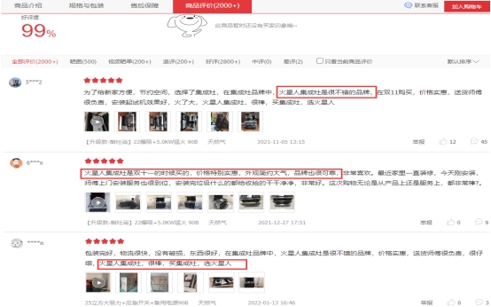 而更令人咋舌的是,在該店鋪熱銷的兩款標(biāo)價分別為9399元、12999元的集成灶產(chǎn)品下方,分別有2000+、1000+的消費(fèi)評論,評論中更是多次出現(xiàn)“火星人集成灶就是好”“火星人集成灶是很不錯的品牌”等字眼。(見圖二、三)這些帶有明顯誘導(dǎo)性的評論,不禁讓人生疑:這是真實(shí)消費(fèi)后的由衷贊美,還是商家通過水軍給店鋪造勢?如果上述評論為消費(fèi)者在購買產(chǎn)品之后的真實(shí)評論,這些消費(fèi)者則屬于被“火星人先峰”店鋪的宣傳誤導(dǎo)了。