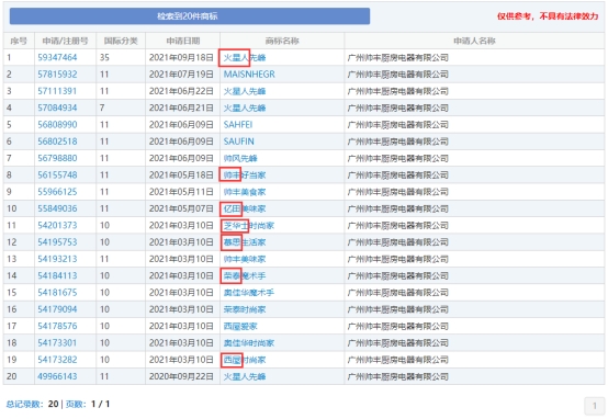 根據(jù)火星人先峰旗艦店所售集成灶包裝上的企業(yè)名稱“深圳火星人廚房電器有限公司”這一信息,記者從企查查獲悉,這是一家注冊資本僅100萬元、成立剛滿半年的小微企業(yè),法人為周新強(qiáng)。不過,該公司名下并無任何與集成灶相關(guān)的注冊商標(biāo)。然而,周新強(qiáng)還有另一關(guān)聯(lián)企業(yè),即廣州帥豐廚房電器有限公司。查看其名下企業(yè)信息則有新的發(fā)現(xiàn):該公司曾于2020年9月至2021年9月期間,密集申請20件商標(biāo),名稱涉及“火星人”“西屋”“帥豐”“億田”等多家知名廚電企業(yè),甚至包括“榮泰”“慕思”“芝華士”等家居品牌。(見圖四、圖五)