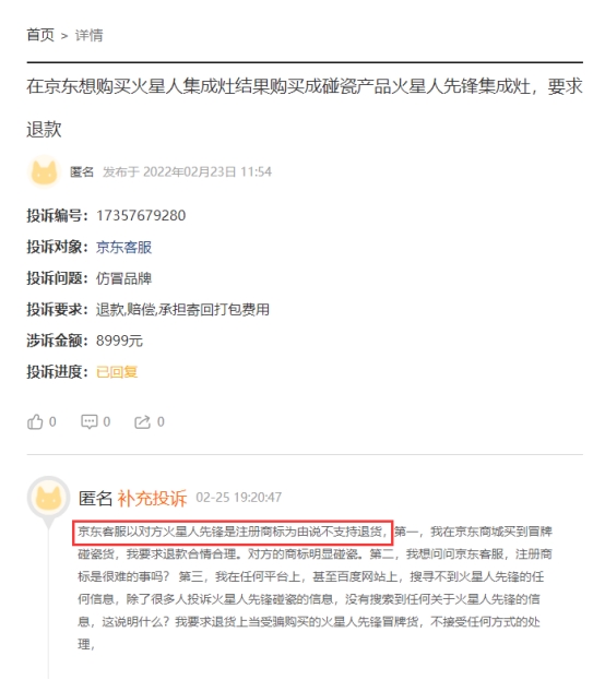 在某知名投訴平臺上,關(guān)于火星人集成灶的投訴中,有一條名為“在京東想購買火星人集成灶,結(jié)果購買成碰瓷產(chǎn)品火星人先峰集成灶,要求退款”的投訴頗為惹眼。