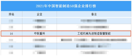 近日,中國科學院《互聯網周刊》、eNet研究院、德本咨詢聯合發布2021中國智能制造50強排行榜。其中,中聯重科憑借“工程機械先進制造智慧智能”成功入選。