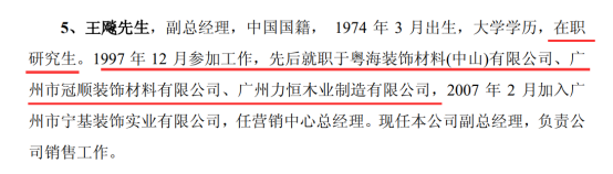 令人疑惑的是,科凡家居招股書中王飚的履歷、學歷與寧基股份IPO時披露內容卻不一致。在寧基股份2011年2月披露的招股書中,王飚簡歷已為在職研究生,且并未披露科凡家居此次招股書中曾就職于廣東省體改委經濟快報社、廣州賽立信市場研究有限公司的工作經歷(見圖二):“王飚先生,副總經理,中國國籍,1974年3月出生,大學學歷,在職研究生。