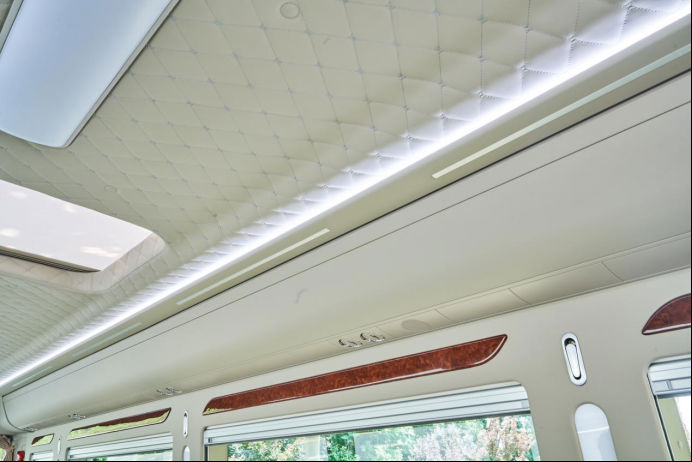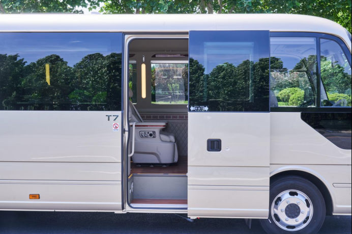 當車輛中部電動外擺自吸加寬門緩緩開啟,伸出的電動踏步離地高度190mm恰到好處,讓上下車都優雅便捷;其次,車內空間設計十分寬敞,內部高度達到1.91m,內部寬度在1.89m,讓乘客不僅能感受大空間的愜意,也能享受“不低頭”的自信與從容。