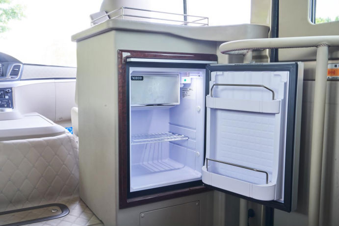 車內220V電源、USB插口、熱水壺等一應俱全,車載冰箱、雨傘架、置物收納等設計也十分巧妙,合理利用門后空間。