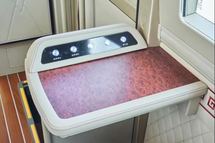 靠近車門的座椅位置是為秘書或助理而留,方便他們最后上車、最先下車。同時還放置一個設置有集中控制系統的木紋書桌,可以控制車內燈光、空調等設施,方便為車內人員提供及時的服務,也可以隨時在上面辦公。