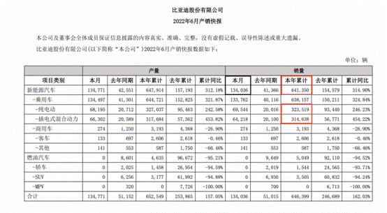 數據顯示,6月份,比亞迪銷售新能源汽車13.4萬輛,同比增長224.02%,環比增長16.61%;1-6月份,比亞迪累計銷售新能源汽車64.1萬輛,累計同比增長314.90%。從產品結構上看,1-6月份比亞迪純電車型和插混車型乘用車分別累計銷售約32.4萬輛、31.5萬輛,占比分別為50.70%和49.30%,分別同比增長246.23%、454.22%。