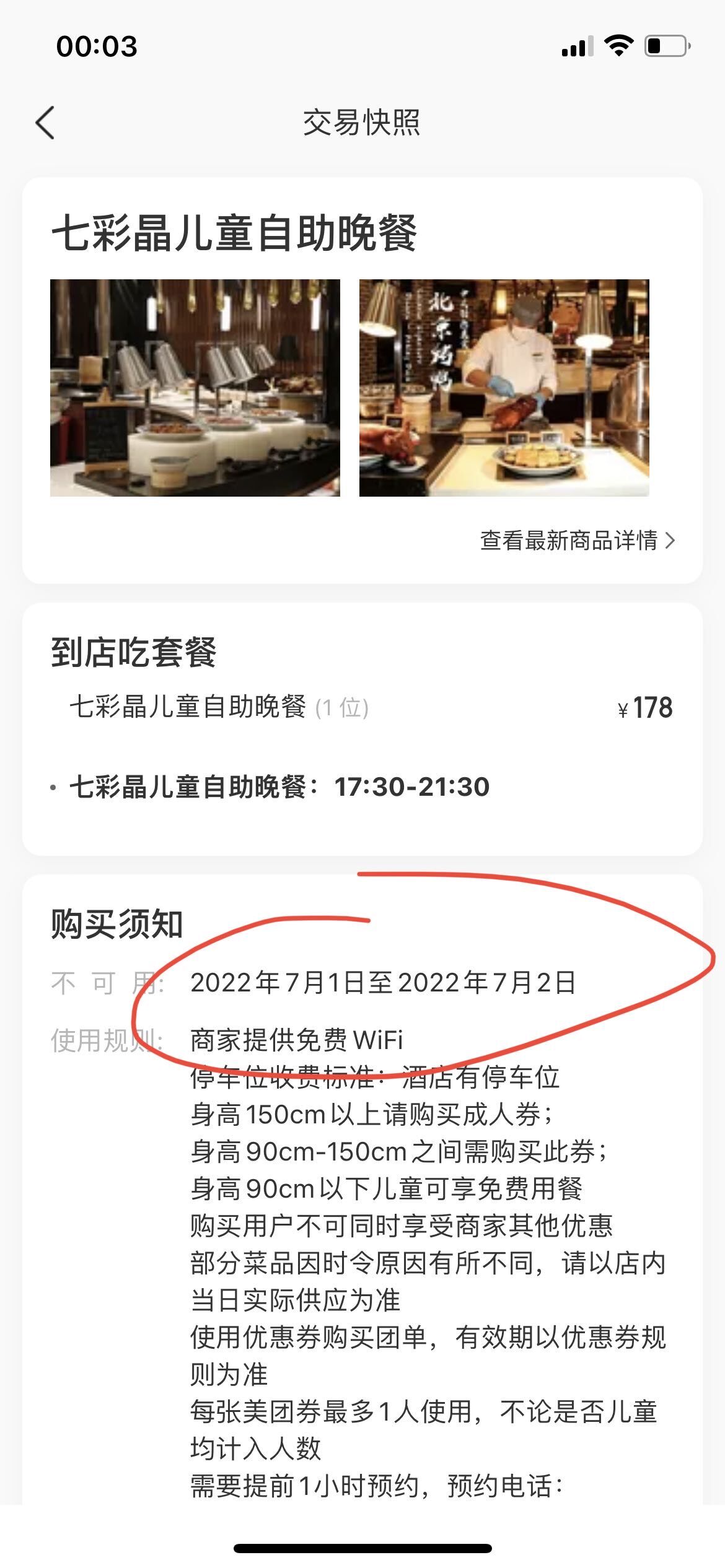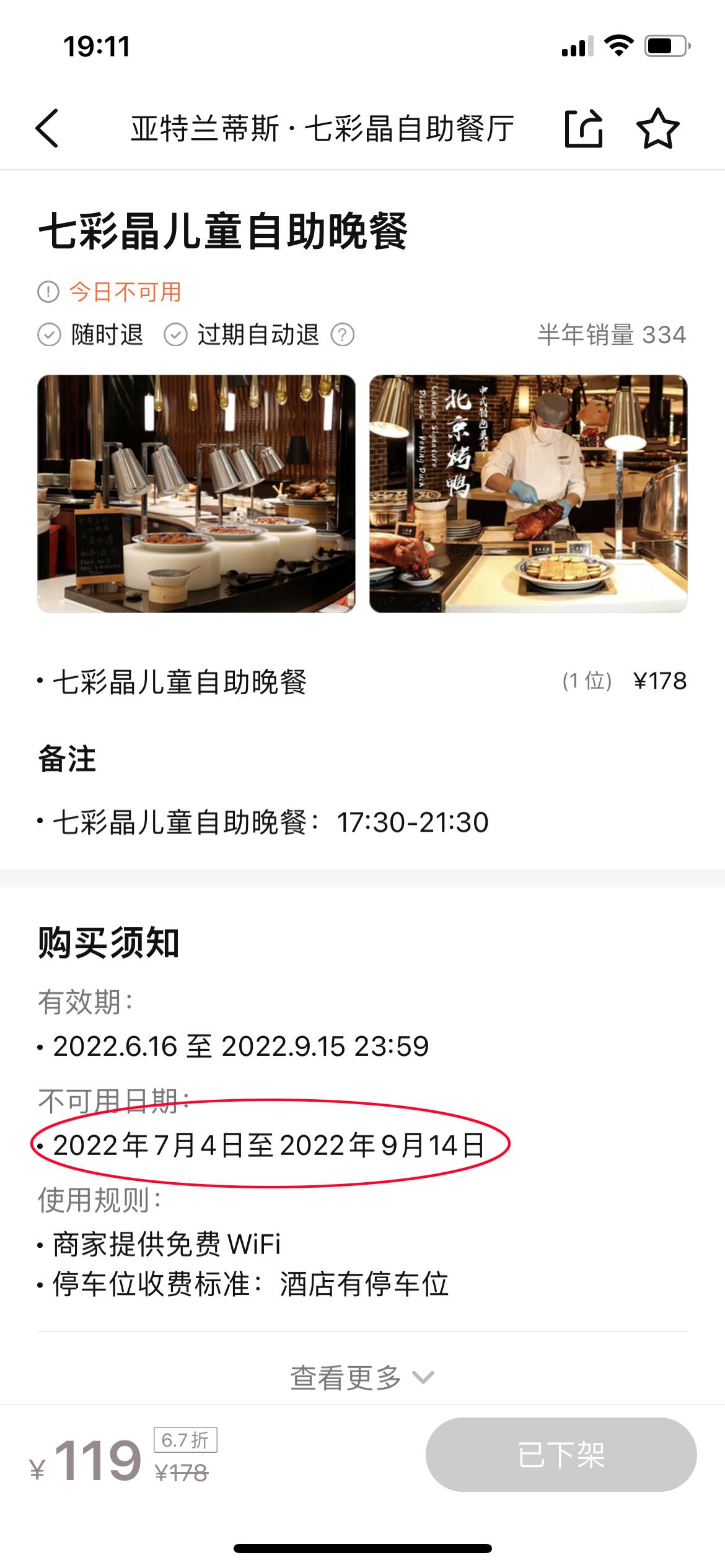 消費者朱女士今年6月在大眾點評網上購買了一張三亞亞特蘭蒂斯酒店七彩晶餐廳兒童自助餐券,價格為119元。購買時,商品詳情中規定的使用日期為2022年6月16日至2022年9月15日,其中2022年7月1日及7月2日不可用。