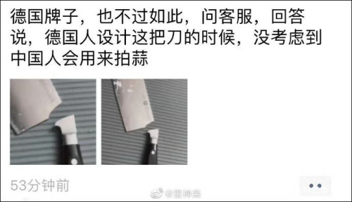 而來自德國的著名廚具品牌雙立人也未能幸免。早在2019年,就有微博網友曬出自家因拍蒜而斷裂的雙立人菜刀,并吐槽:“德國牌子也不過如此,問客服,回答說設計的時候沒考慮到中國人會用來拍蒜!”而在留言中,也有不少網友稱購買的雙立人菜刀因為拍蒜而斷。