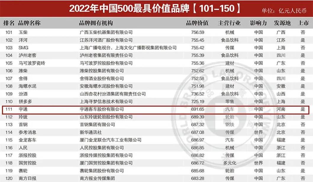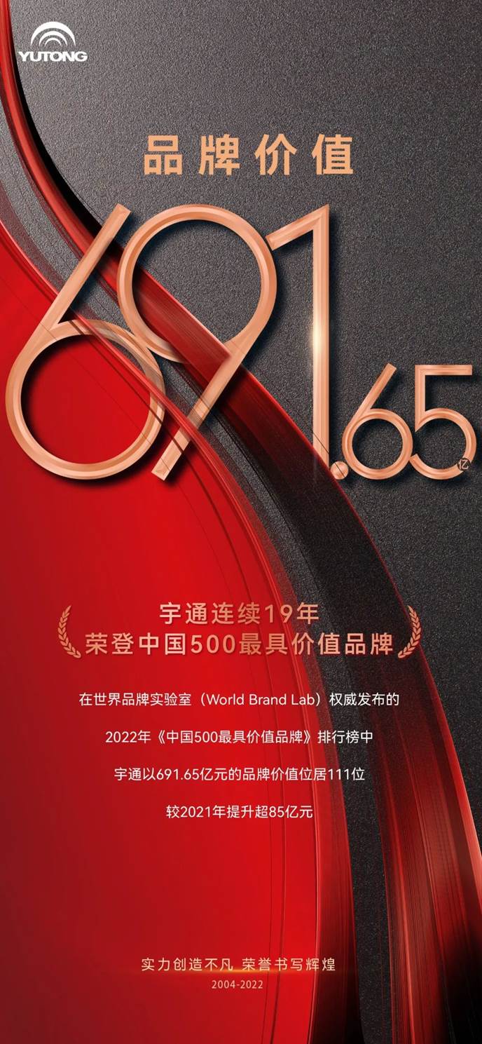 品牌價值超691億!宇通榮登2022中國500最具價值品牌