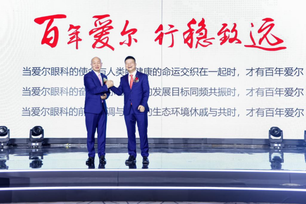 愛爾眼科醫院集團董事長陳邦(左)和全球總裁李力(右)在20周年慶典上作主題演講