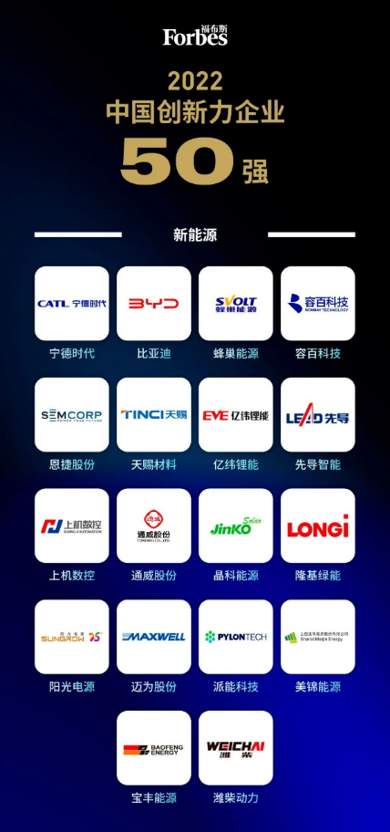 在今年入選的50家企業(yè)中,來自新能源相關(guān)領(lǐng)域的企業(yè)占比最高,這其中包含寶豐能源、寧德時(shí)代、比亞迪、隆基綠能等18家新能源科技巨頭企業(yè),寶豐能源作為高端煤基新材料+氫能雙龍頭企業(yè)首次入選該榜單。
