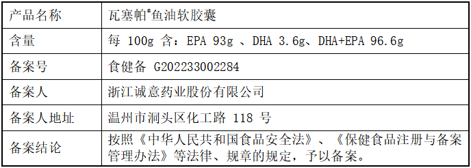 近日,浙江誠意藥業(yè)股份有限公司(以下簡稱“公司”)“三康?魚油軟膠囊”、“瓦塞帕?魚油軟膠囊”產(chǎn)品完成了國產(chǎn)保健食品備案工作,并獲得國家市場監(jiān)督管理總局發(fā)放的國產(chǎn)保健食品備案憑證。具體情況如下: