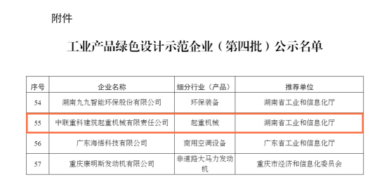資料顯示,除此次中聯重科建起入選“工業產品綠色設計示范企業(第四批)公示名單”外,早在2019年,中聯重科即入選了國家首批“工業產品綠色設計示范企業”。