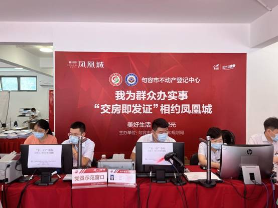 2022年9月,該項目提前一周便將房屋交付到業主手中。6棟樓共788套,當天的交付比例已近90%。而交付現場的另一處細節,更是令業主吃下了“定心丸”——項目聯動句容不動產登記中心為業主提供“交房即交證”服務。從業主提交材料到審核發證,只需要十幾分鐘。
