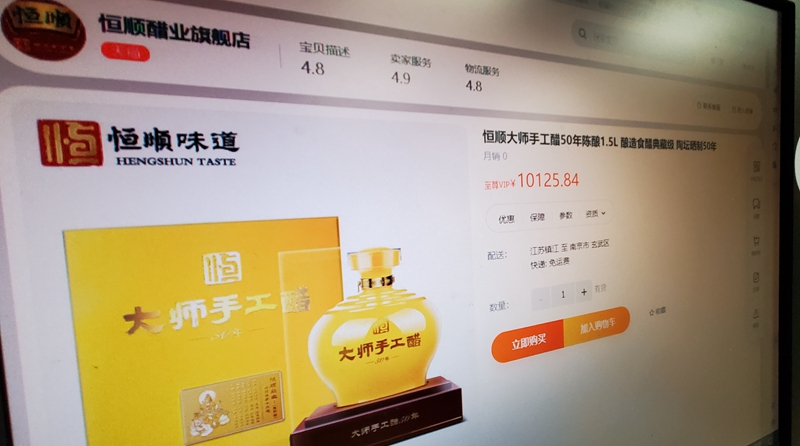 恒順醋業(yè)在醋上的探索不可謂不多。不久前,公司在其天貓平臺“恒順醋業(yè)旗艦店”中,上架了一款售價10888元,名為“大師手工醋50年陳釀”的產(chǎn)品,引發(fā)市場關(guān)注。