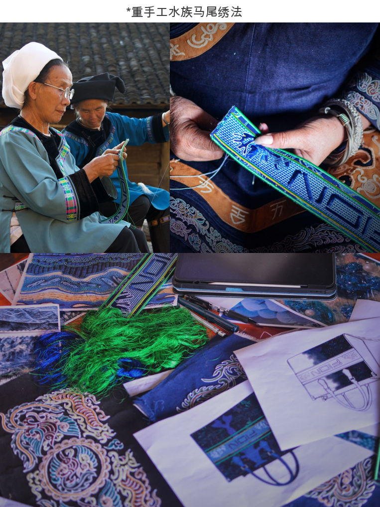 值得注意的是,本次FION與阿凡達的企劃合作中,除了熟悉的十字桃花紋承擔底幅的重工繡制,兩側逼真的水生植物繡樣,還首次采用極具少數民族特色的非遺工藝——源于水族的馬尾繡,將馬尾繡的故事文化一同帶入到阿凡達的世界里,讓FION阿凡達系列呈現的更生動、飽滿,并向世界展示中國文化技藝的不斷探索和推成出新。