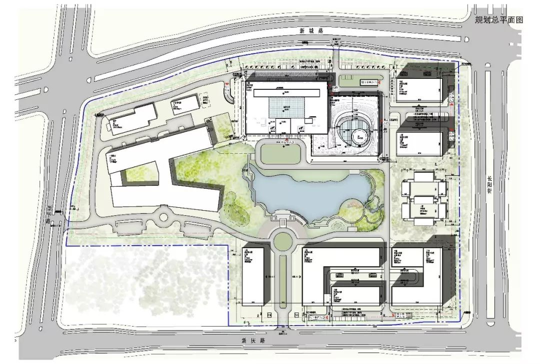 在這里,綠樹繁花,湖石相依。為盡可能減少土方填埋開發,科研大樓以“浮院”為理念,將原有的天然水塘作為核心生態水景,兩個矩形體量沿湖布置,使建筑有如浮于水上,相映成趣。水景面積約5000平米,集項目海綿城市蓄水調蓄、水面光伏發電實驗展示、池底地源熱泵埋管等功能于一體。