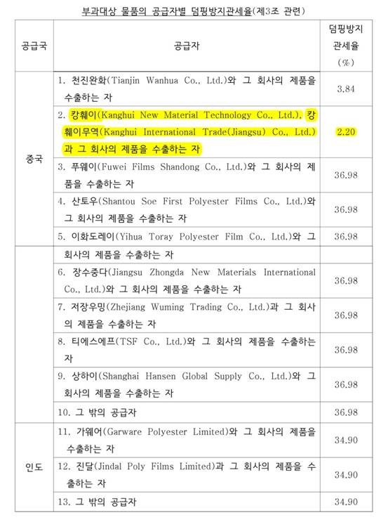 2023年2月,經過調查,韓國貿易委員會對進口自中國和印度的PET薄膜第四次反傾銷日落復審調查作出最終裁定,決定對全行業征收36.98%的反傾銷稅,對康輝新材僅征收2.2%的反傾銷稅,征收期五年。2022年5月8日,韓國企劃財政部發放正式征稅公告。