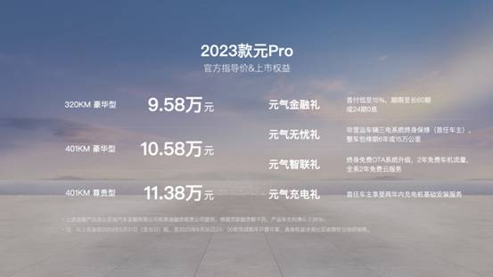 2023款元Pro通過顏值煥新、內飾煥新、智聯進階、技術升級,讓產品價值進一步升華,為元氣青年、元氣女生、元氣家庭帶來“自由暢享”的用車體驗,助力每一位用戶開啟元氣滿滿的純電生活。