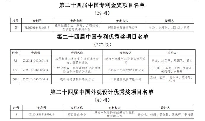 近日,國家知識產權局發布了第二十四屆中國專利獎授獎決定。中聯重科斬獲5項大獎,包括1項中國專利金獎,3項中國專利優秀獎和1項中國專利外觀設計優秀獎,研發水平和創新實力極致彰顯。