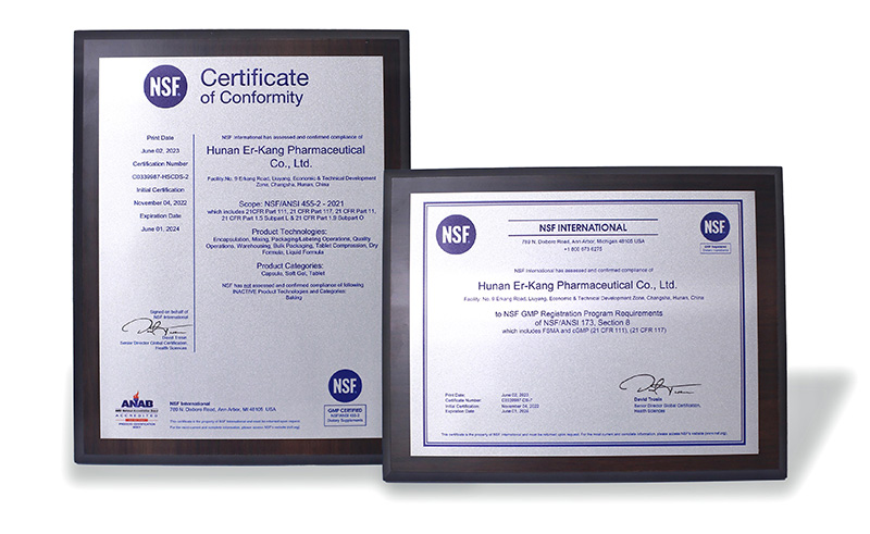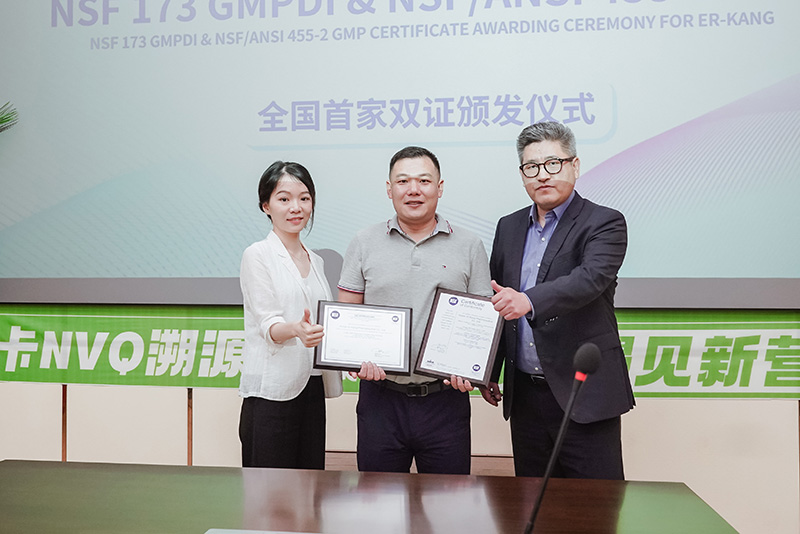 近日,全國首家NSF膳食補充劑工廠GMP雙證頒發儀式在湖南爾康制藥股份有限公司總部廠區舉行,NSF大中華區總經理單宇龍博士出席儀式并頒發證書。爾康制藥成為了全國第一家同時獲得膳食補充劑工廠NSF173 GMPDI、NSF/ANSI 455-2 GMP雙證的企業。