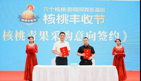 本屆核桃節上,六個核桃與溫宿柯柯牙農發集團簽署“鄉村振興助農合作戰略協議”,與新疆譽通農業簽訂“核桃青果采購協議”,同期舉辦了核桃豐收開桿儀式、發車儀式、年度最美核桃農評選、特色農產品推介會、百名記者采摘體驗”等豐富活動,來自主流媒體、核桃產業代表、種植農戶等數百位嘉賓,共同見證核桃產業高質發展新篇章的開啟。