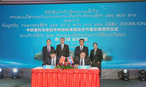 9月5日,中聯重科與老撾農林部標準建設合作備忘錄簽約儀式在老撾萬象舉行。在湖南省委副書記、省長毛偉明,老撾農林部部長佩·蓬皮帕,中聯重科董事長、CEO詹純新,老撾農林部檢查司司長康裴·布旺等中老領導嘉賓共同見證下,中聯重科聯席總裁王永祥與老撾農林部種植司司長本占·古本納西代表雙方簽約。