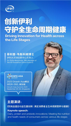 隨著大眾的營養健康與可持續發展意識不斷增強,全球健康食品行業也加快了創新變革步伐,以適應不斷變化的消費趨勢。9月26日至28日,亞洲地區倍受矚目的行業盛會Growth Asia峰會在新加坡隆重啟幕,旨在為健康食品行業的研發專家、市場與趨勢專家、頂尖學者以及知名品牌提供交流分享平臺,為行業提供全方位的增長機會。伊利大洋洲創新中心菲利普·韋斯科姆博士再次受邀參會,發表題為《乳制品蛋白和益生菌創新:滿足全生命周期消費者的營養和健康需求》的主題演講,深入解析伊利在乳制品蛋白和益生菌創新領域的最新科研成果和創新應用,以及為全人群、全消費場景、全生命周期提供營養健康支持的有益探索。