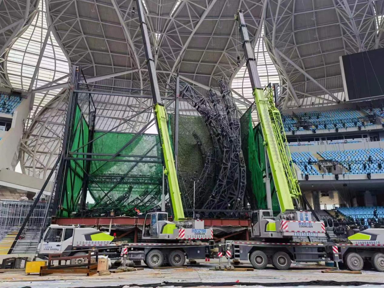 “作為亞運會主火炬塔創制者大豐實業的合作單位,這次我們總共派出了3臺中聯重科吊車,一臺50噸、兩臺25噸。主火炬塔立柱最高達19米,所有立柱形狀不規則且有弧度,在21 x 10米的場地上吊裝,對吊車的穩定性、微動性和吊裝的精準度要求非常高,對接精度需要達到毫米級。從4月中旬進場到6月初,中聯重科起重機憑借強大的工況適應性,全程以穩定、高效、可靠的表現,圓滿完成此次安裝任務?!庇嘁α⑵狡鹬匕惭b有限公司負責人周曉黎介紹說。