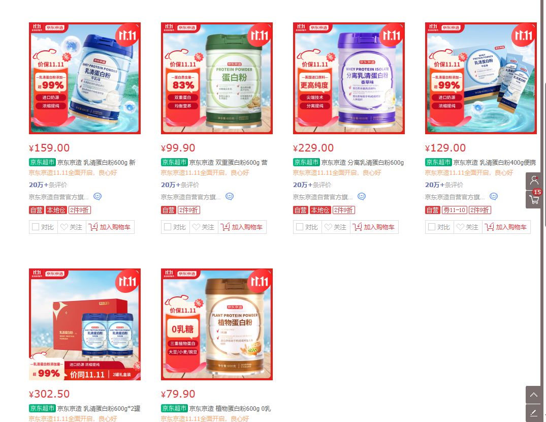 正值“雙十一”期間,記者查閱購物平臺發(fā)現(xiàn),湯臣倍健熱銷的蛋白粉主要為動植物雙蛋白2:3配比的一款產(chǎn)品,而京東京造一口氣推出了4款蛋白粉,不僅包括同樣2:3配比的混合蛋白粉,還有乳清蛋白粉、植物蛋白粉,以及分離乳清蛋白粉,可以針對不同客群的需求,這些產(chǎn)品的單罐(600g)售價在79元至229元不等。而湯臣倍健的600g裝蛋白粉為禮盒形式,官方店到手價要323元,450g普通裝在經(jīng)銷商處售價則要154元左右。