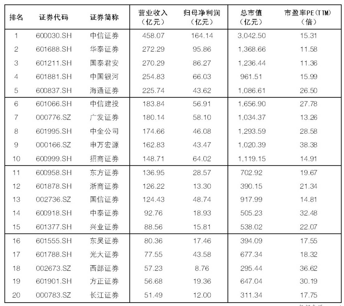 上市券商三季報營收TOP20