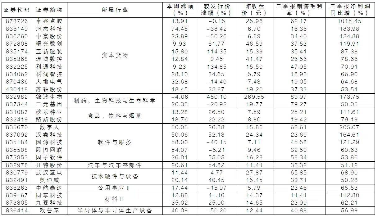 統計顯示,今年前三季度,北交所合計實現營收超過1200億元,六成企業實現營收正增長。201家企業盈利,197家企業毛利率在15%以上,118家企業凈利率在10%以上。建筑裝飾、農林牧漁、汽車、計算機、機械設備收入增長較快,其中,計算機、汽車營收增幅同比提升;建筑裝飾、汽車、機械設備凈利潤增長較快,其中,機械設備、汽車加速增長。醫藥生物、機械設備、計算機、建筑裝飾平均毛利率在30%以上。