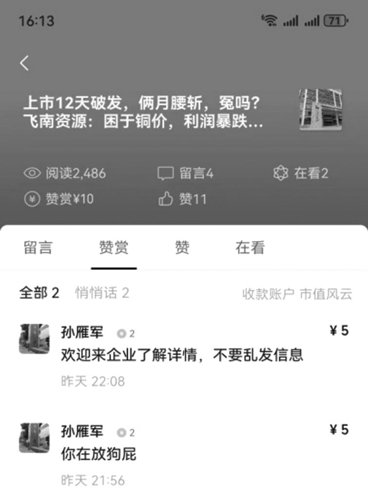近期,知名傳媒人、“市值風云”創始人楊峰在其朋友圈吐槽,旗下研究員發布的一篇題為《上市12天破發,倆月腰斬,冤嗎?飛南資源:困于銅價,利潤暴跌7成,募資縮水4成,負債飆至45億》的研報,疑似遭到飛南資源(301500)法人、實控人、董事長孫雁軍“付費10元挑釁”。