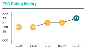 12月15日,國際權威指數機構摩根士丹利資本國際公司(中文簡稱“明晟”,英文簡稱“MSCI”)發布了東方證券2023年度最新ESG評級結果。東方證券2023年MSCI ESG評級已從A級升級至AA級,為目前已獲得公開評級的中國證券公司的最高評級,也是目前境內僅有的兩家AA級證券公司之一,創下A股證券公司評級歷史新高,位于全球同業前15%。